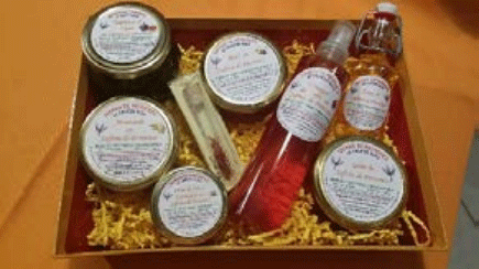 → 1 tube pistil 0.1 gr + 1 sirop de Safran 4cl + 1 sel au safran 50 gr + 1 moutarde au safran 100 gr + 1 confiture 210 gr (parfum au choix) + 1 gelée de Safran 110 gr + 1 vinaigre de Safran 20 cl Spray + 1 miel au safran 120 gr