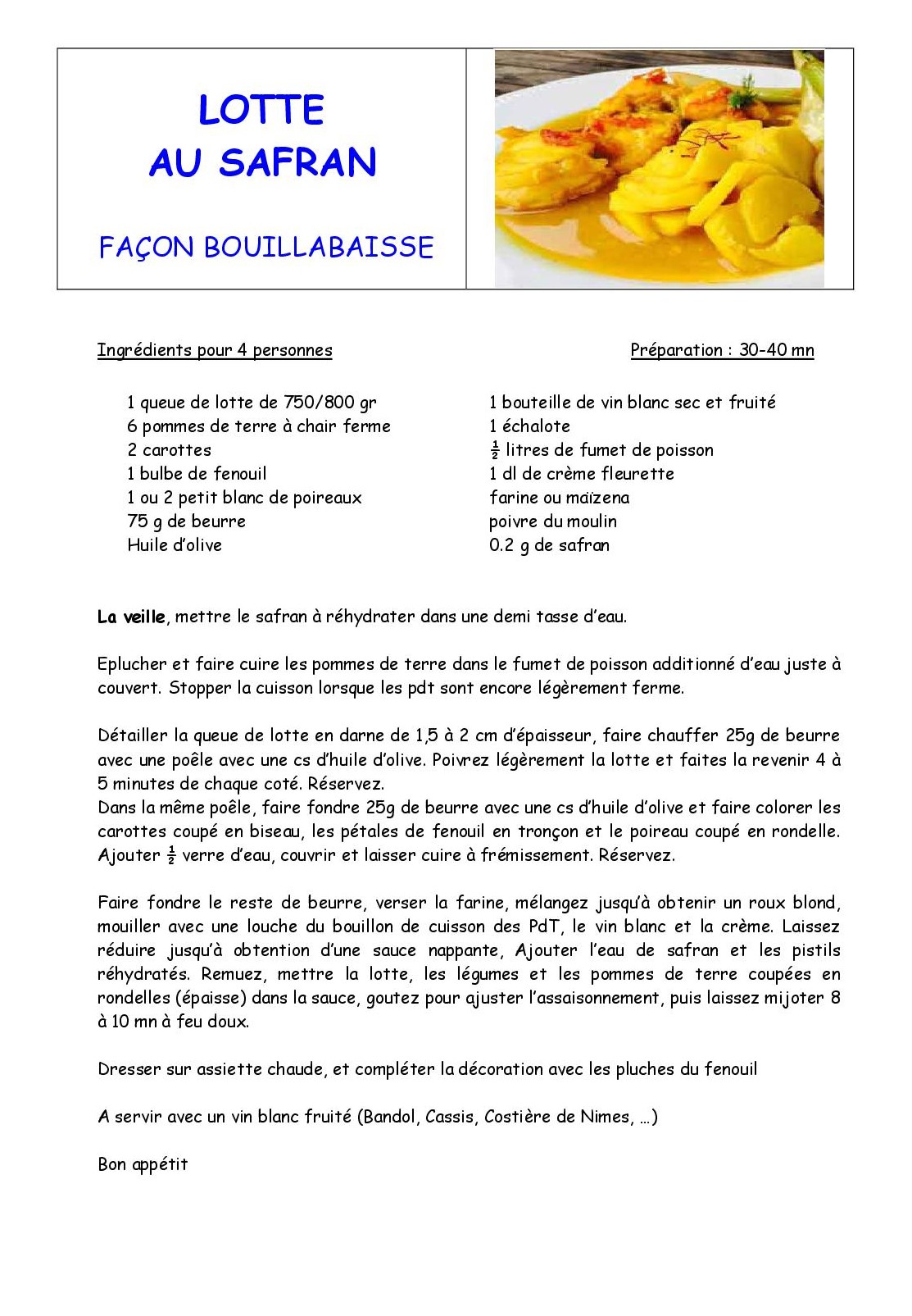 Faite fondre le reste de beurre, versez la farine, mélangez jusqu'à obtenir un roux blond, mouillez avec une louche du bouillon de cuisson des pdt, le von blanc et la crème. Ajoutez l'eau de safran et lies pistils réhydratés. remuez, mettre la lotte, les légumes et les pdt coupés en rondelles (épaisses) dans la sauce. Goutez pour ajuster l'assaisonnement puis laissez mijoter 8 à 10 mn à feu doux.